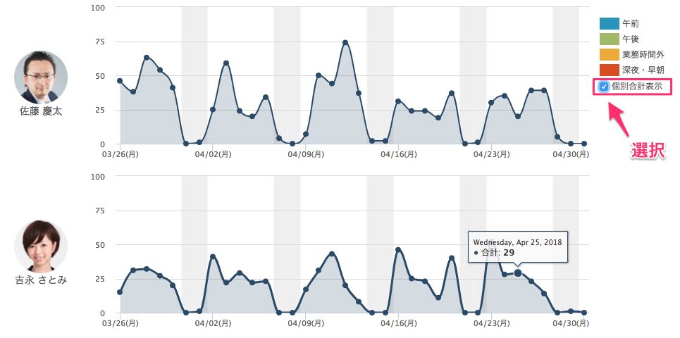「個別合計表示」を選択することで、ユーザ毎に日毎の合計の発言数を確認できます。