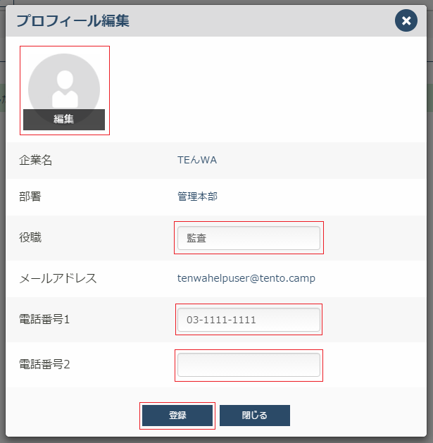 [アイコン][役職][電話番号]はユーザーが編集することができ、その際は[編集]ボタンをクリックしてください。